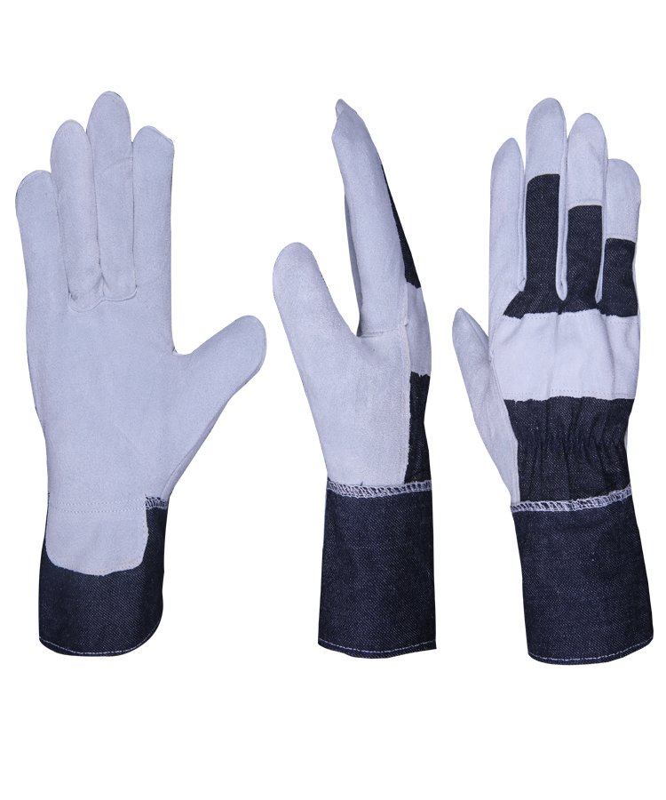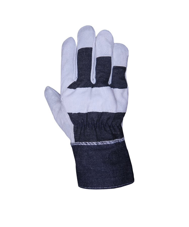 The glove is made of Cowhide Split leather with enhanced tensile and abrasion performance contrast overall light weight of the gloves, back made of denim jeans fabric with safety cuff is suitable for most handling operations including janitorial work and gardening.