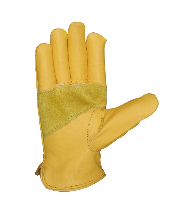 The glove is made of soft Dyed Goat skin leather, Reinforcement cowhide split leather palm with enhanced tensile and abrasion performance contrast overall light weight of the gloves, Elasticated back and edged hem cuff is suitable for most handling operations including janitorial work and gardening.