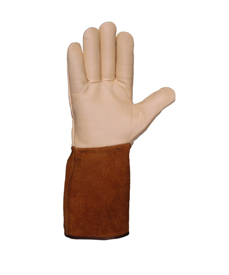 Welding Gloves & Heat-Resistant Gloves provide arm and hand protection against the sparks and heat that result from the welding process. This glove is made from premium selected goat skin leather front palm & back with soft shoulder split natural cowhide leather with heat-resistant treatment (THT) back safety cuff and stitched. DuPont™ Kevlar® thread Polyester piping.