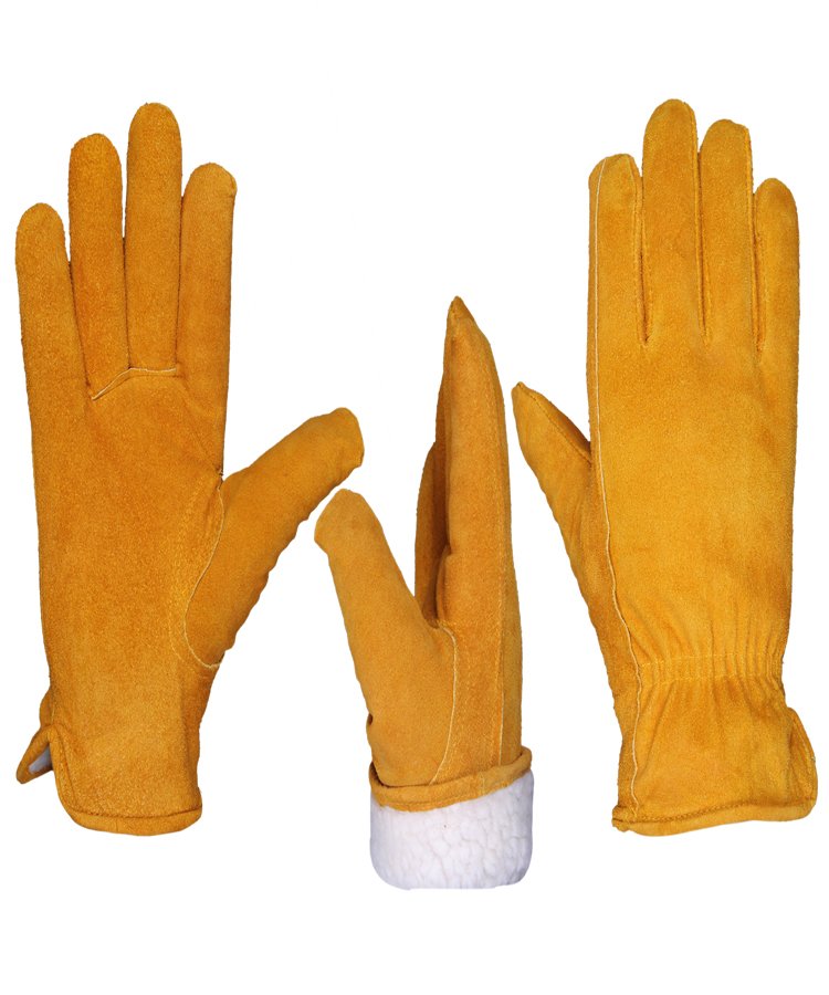 The glove is made of soft dyed Cowhide Split leather & full fur lining inside with enhanced tensile and abrasion performance contrast overall light weight of the gloves, elasticated back and edged hem cuff is suitable for most handling operations including janitorial work and gardening.