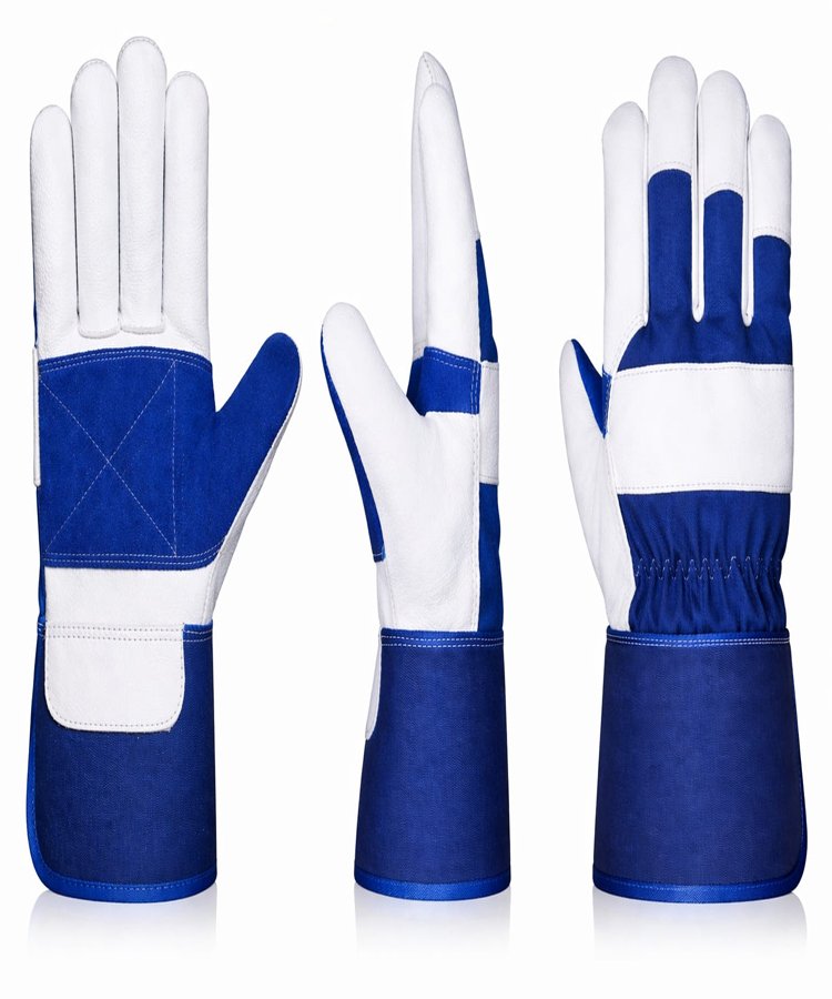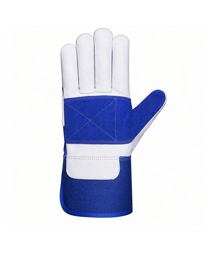 The palm is constructed from high-quality smooth cowhide leather, providing a natural grip, flexibility, and excellent handling control. For enhanced durability, the glove features a reinforced blue split leather double palm, strategically applied to high-wear areas to significantly improve abrasion resistance and extend product lifespan.