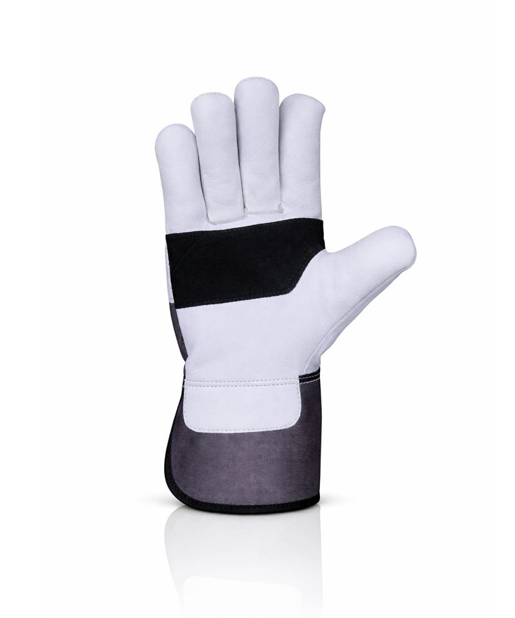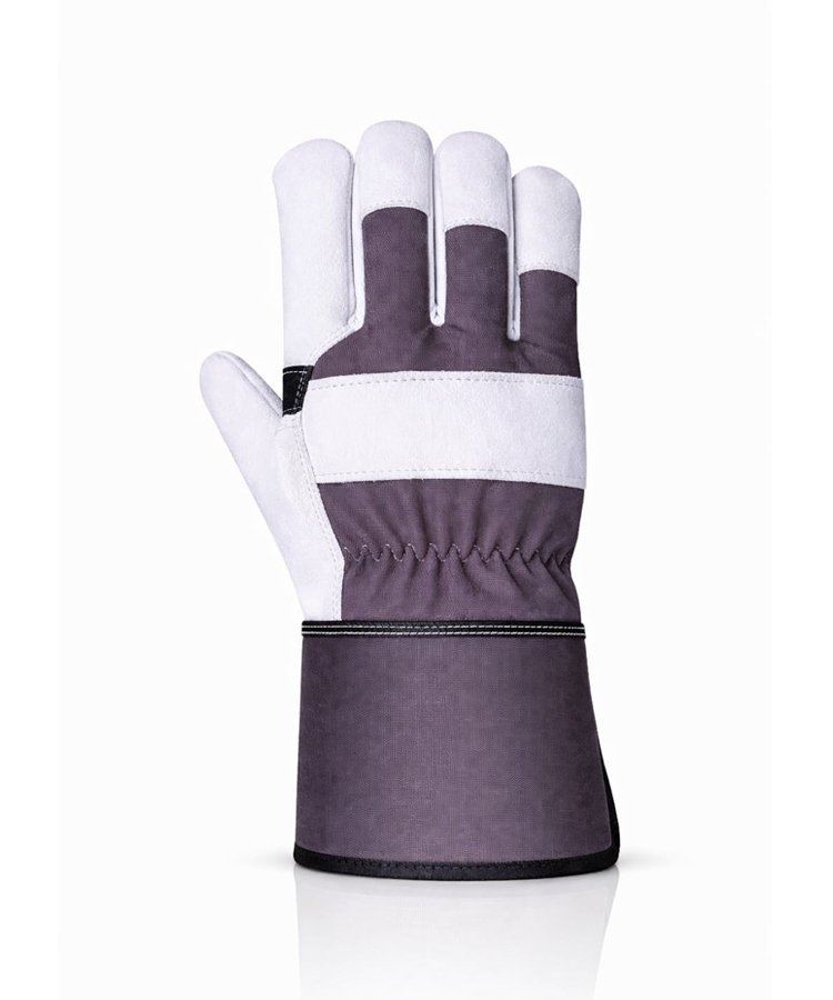 The back of the glove is made from durable cotton fabric combined with leather finger panels, ensuring breathability, comfort, and unrestricted hand movement during extended working hours. An integrated elasticized back section provides a secure and stable fit, helping the glove stay firmly in position while minimizing the entry of dust and debris.