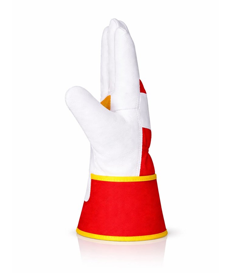 The glove is equipped with a rubberized extended safety cuff with reinforced yellow piping, offering additional wrist and forearm protection while allowing quick and easy wear and removal.