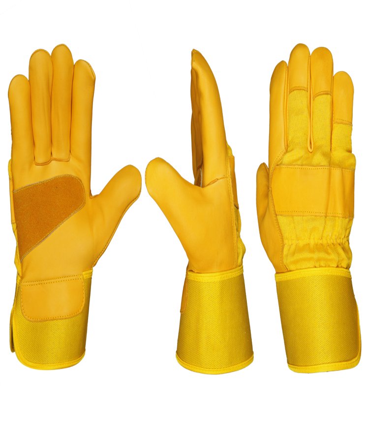 The glove is made of soft Dyed Sheep skin leather & reinforcement Dyed cowhide split leather palm with enhanced tensile and abrasion performance contrast overall light weight of the gloves, back made of cotton fabric with rubberized safety cuff is suitable for most handling operations including janitorial work and gardening.