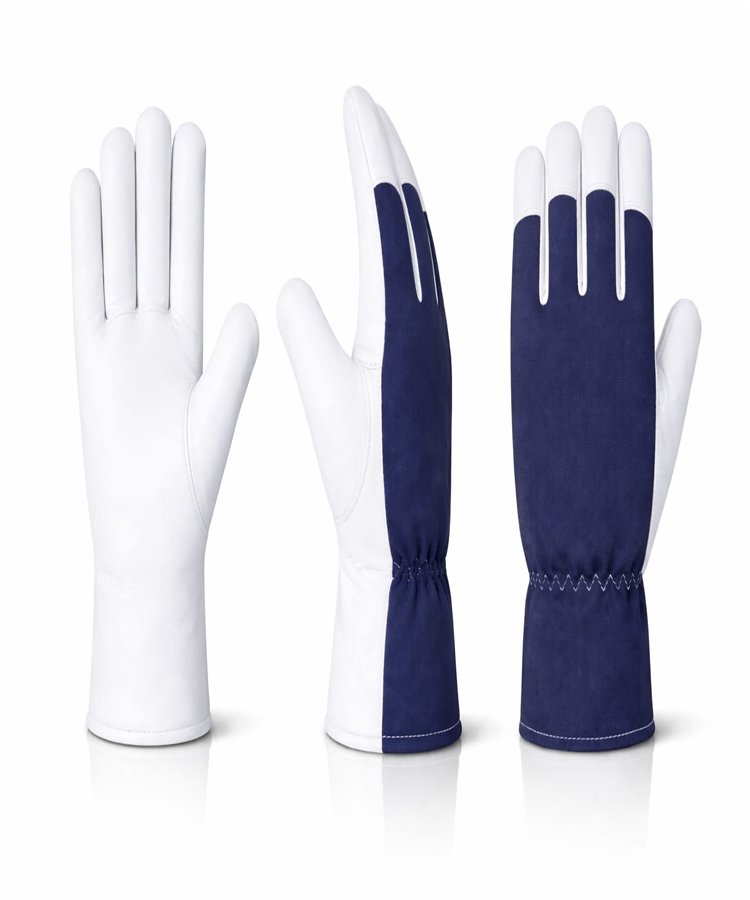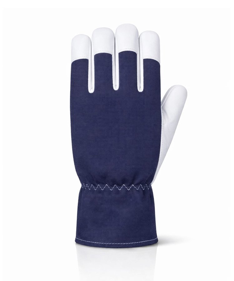 High-quality assembly work gloves manufactured using premium soft sheepskin leather on the palm and full finger fronts to deliver excellent tactile sensitivity, flexibility, and a smooth natural grip, combined with a breathable four-way stretch fabric back for enhanced airflow, comfort, and ergonomic performance.