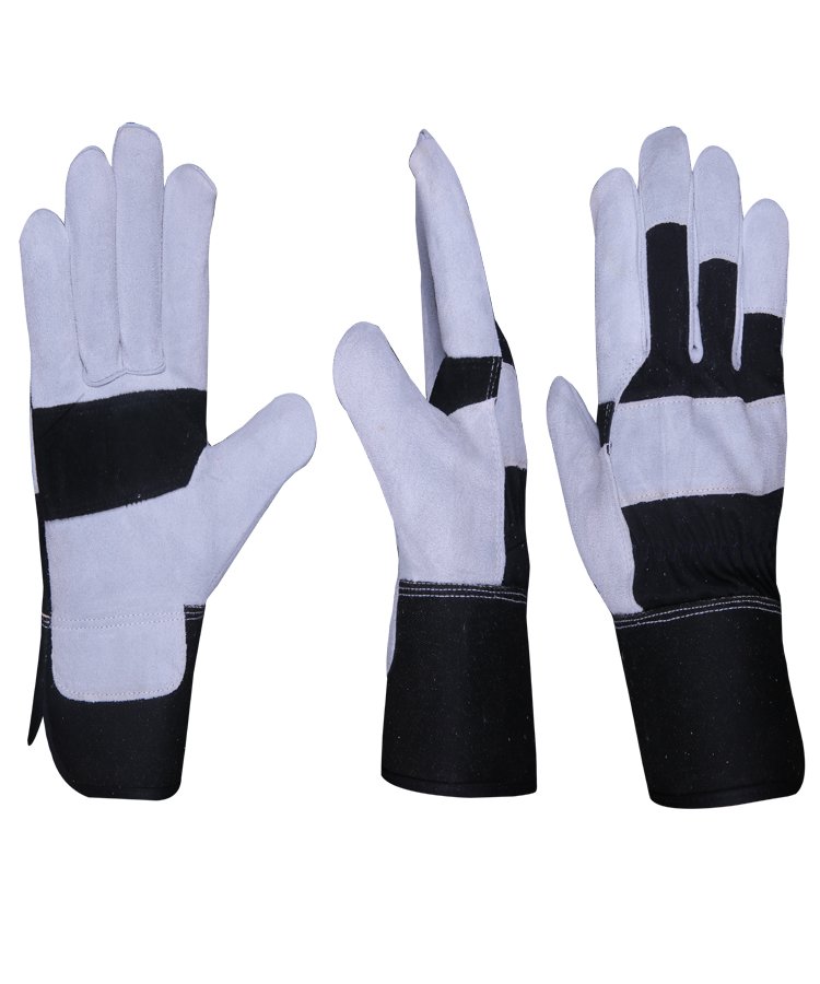 The glove is made of soft Cowhide split leather & reinforcement palm with enhanced tensile and abrasion performance contrast overall light weight of the gloves, back made of cotton jeans fabric with rubberized safety cuff is suitable for most handling operations including janitorial work and gardening.
