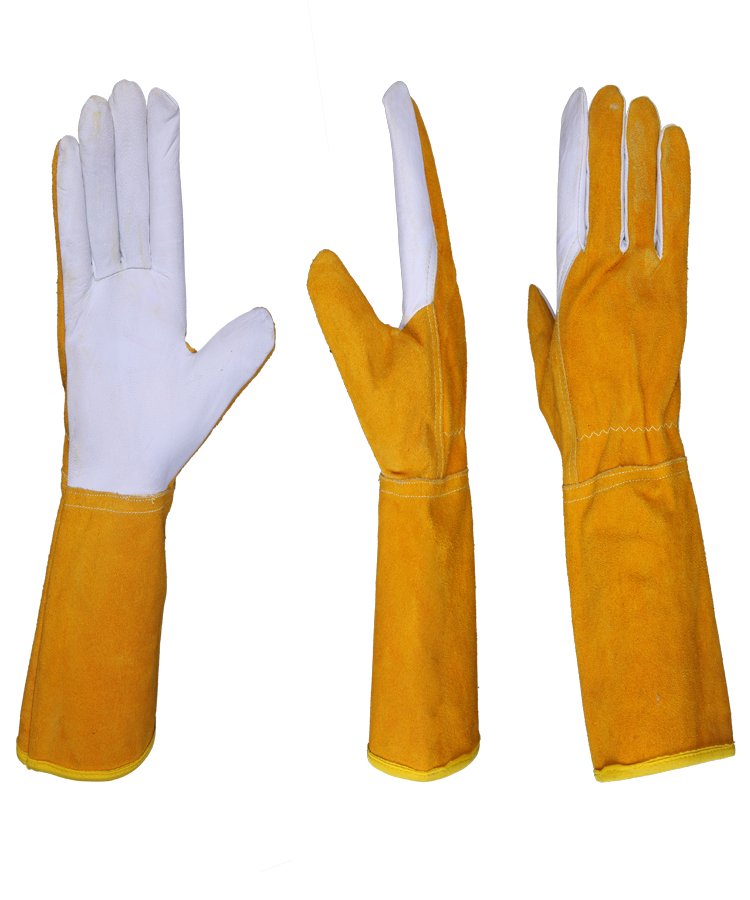 Welding Gloves & Heat-Resistant Gloves provide arm and hand protection against the sparks and heat that result from the welding process. This glove is made from premium selected goat skin leather front palm, soft shoulder split natural cowhide leather with heat-resistant treatment (THT) back with safety cuff and stitched with DuPont™ Kevlar® thread, Polyester piping.